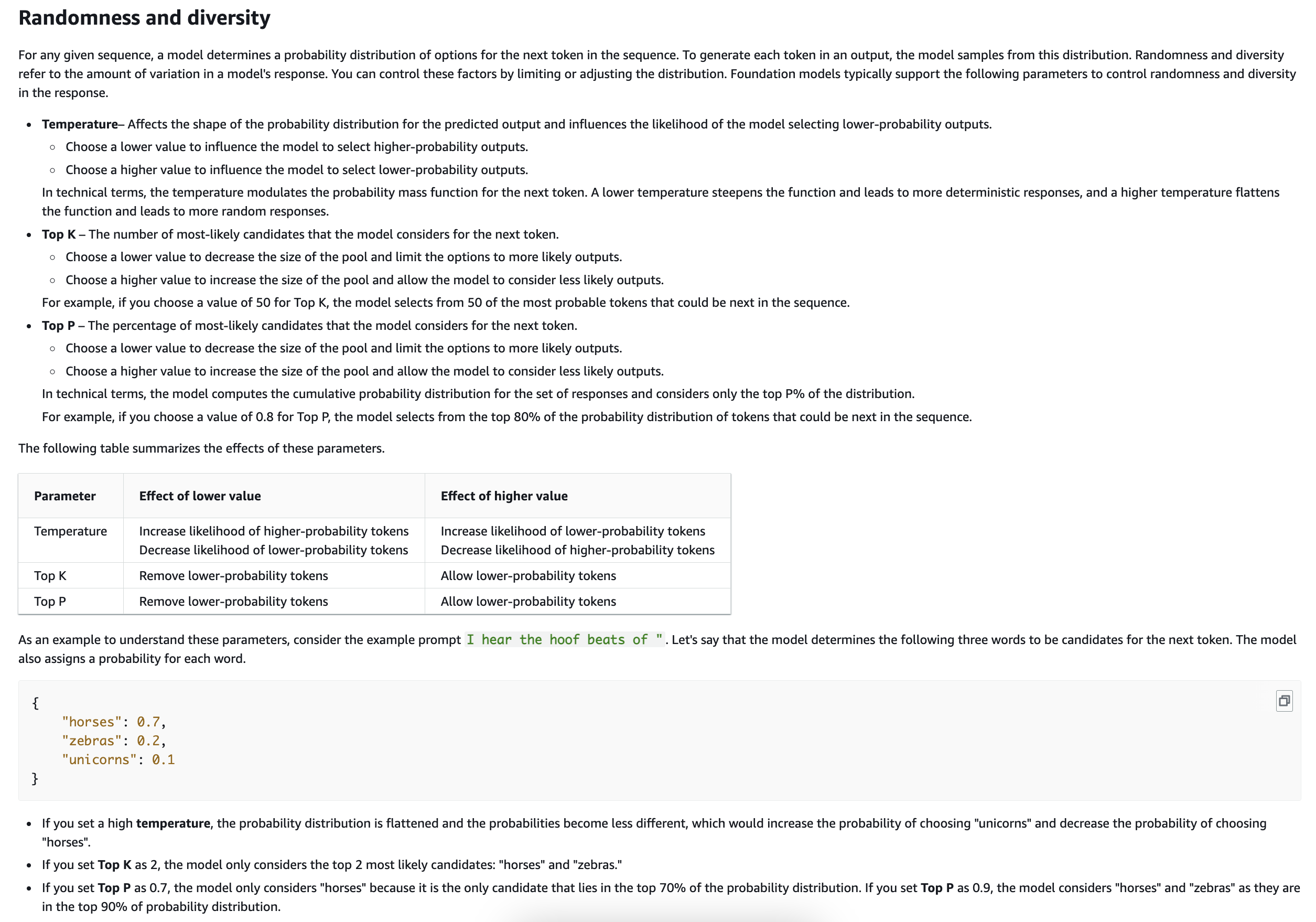 - A smaller KK value makes the output more deterministic and focused, as the model is limited to a narrow set of high-probability tokens.